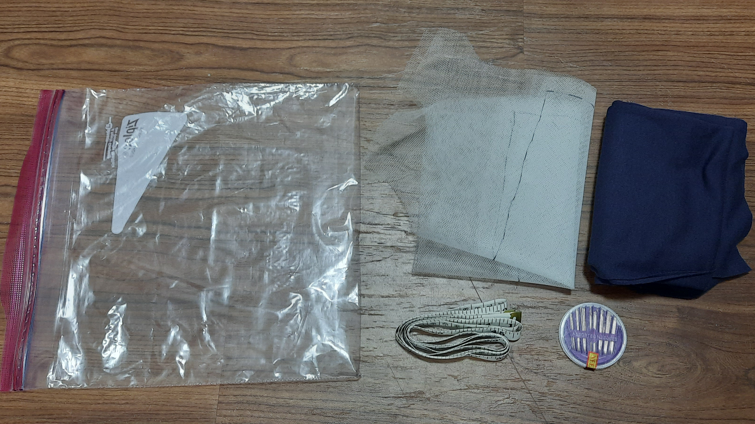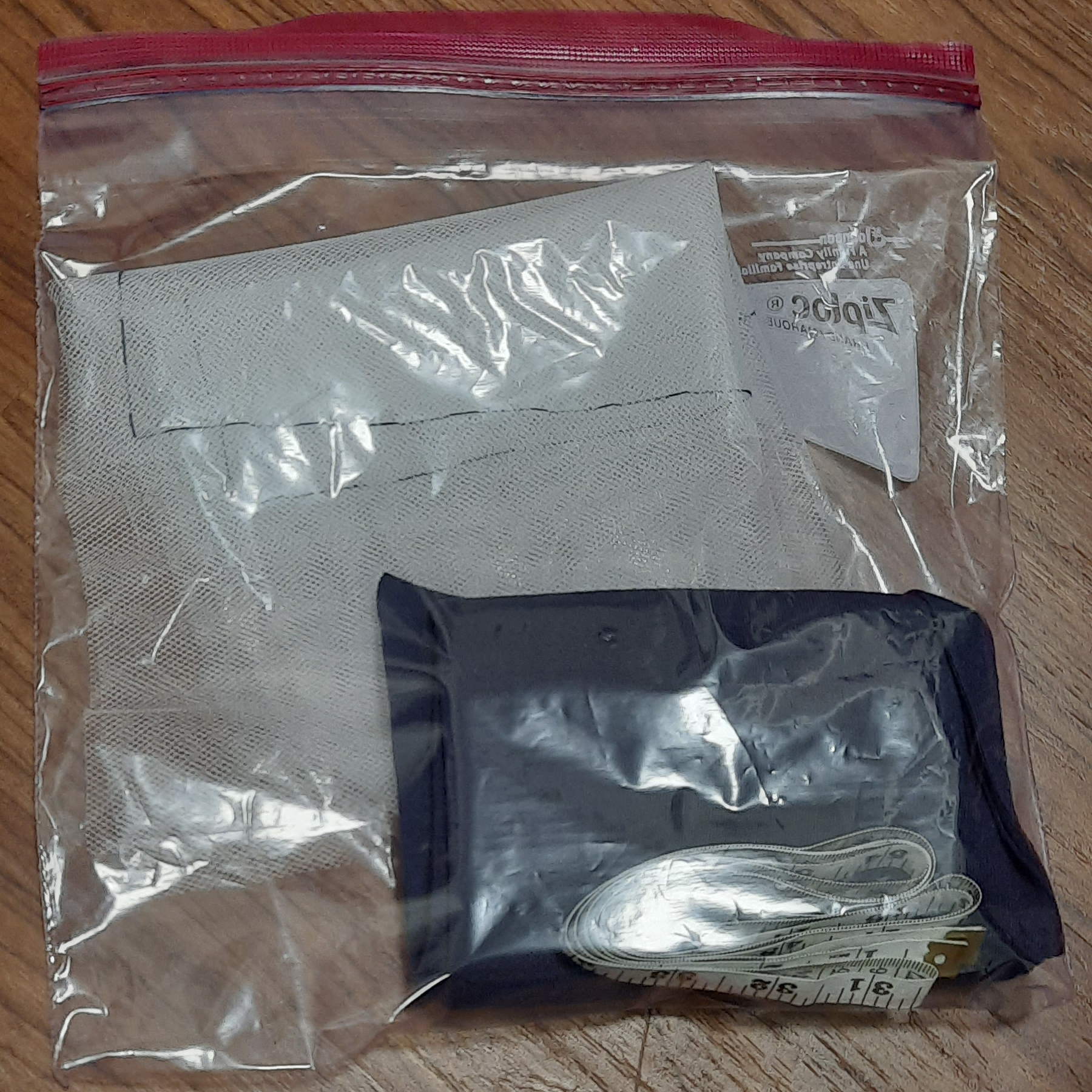 To create the prototype I went to the nearby Walmart. After purchasing 5 cans of spray paint an SD card, and getting IDed I purchased the required fabric. While it is a prototype and does not have to be exactly what the final product would be I tried to get as close as possible. This resulted in me purchasing a stretchy and soft jersey style cotton and white mesh to provide support. After accidentally cutting the fabric from the center of the material and spilling a pack of 25 sewing needles I had the sewing materials prepared. I put some sewing needles in the bag (secured not just loose needles) and my tape measure as a proof of concept. A measuring tape would be included in the bag to take your own measurements.
